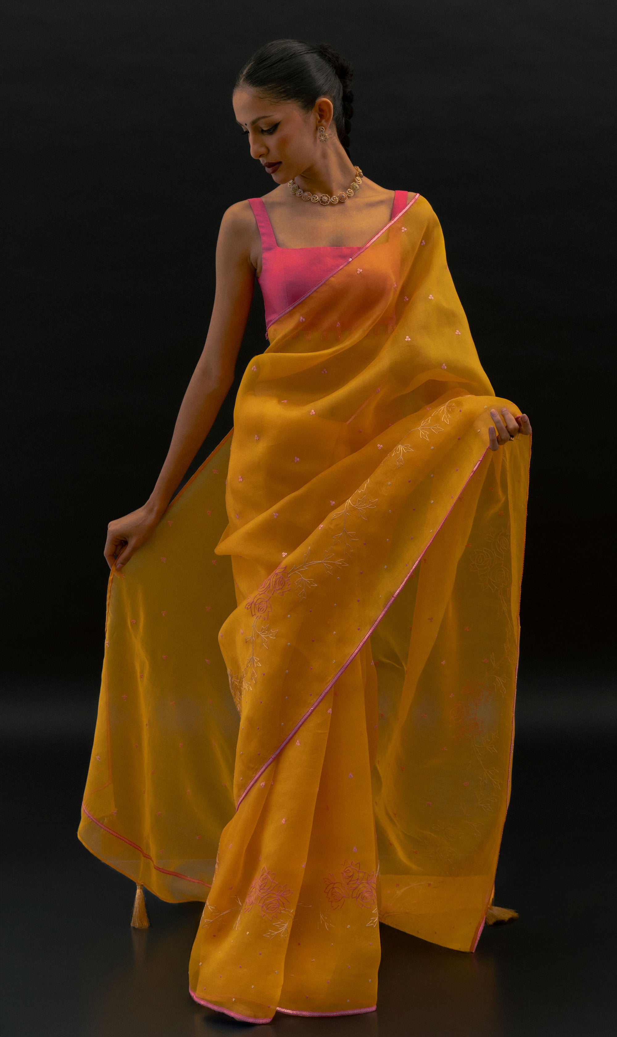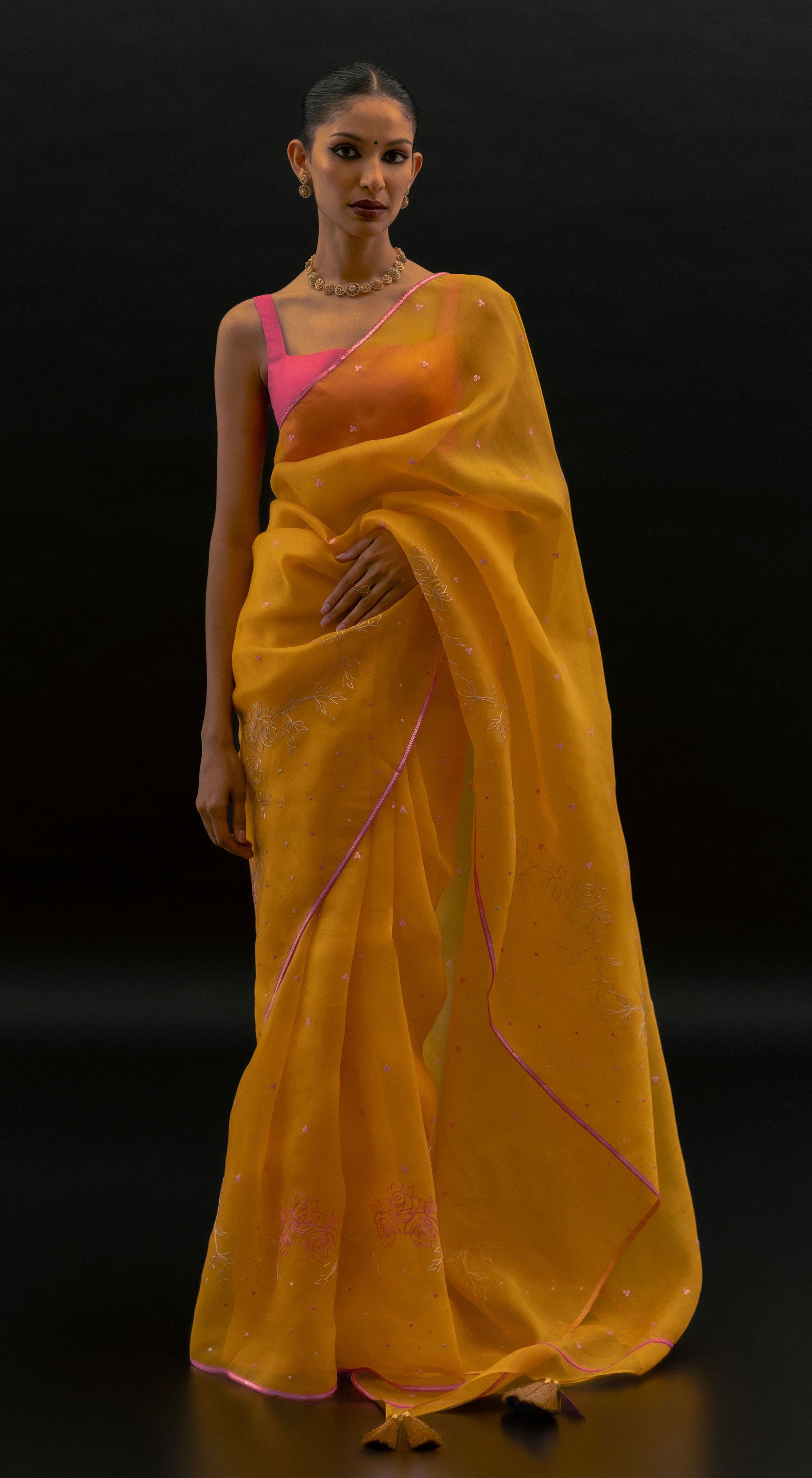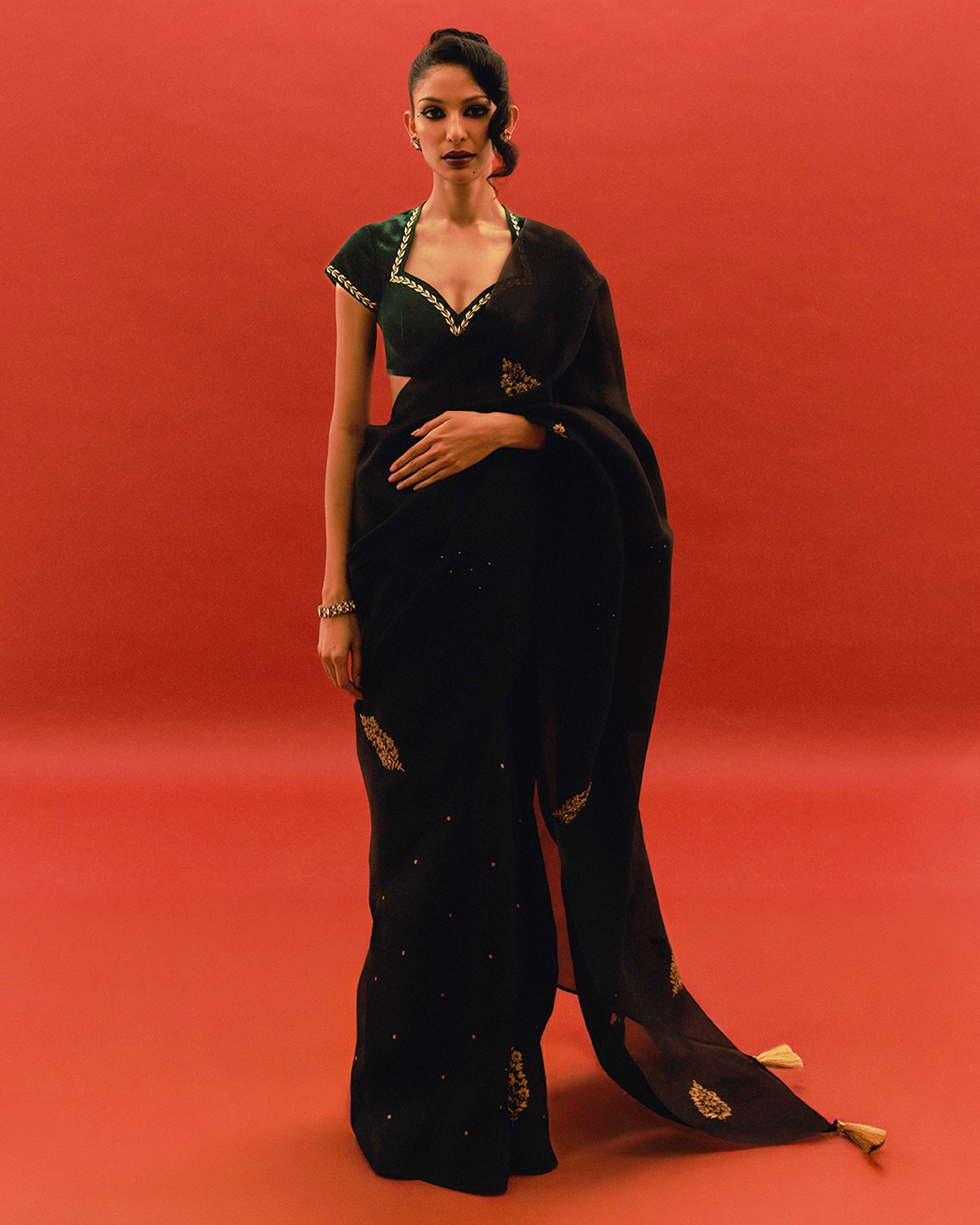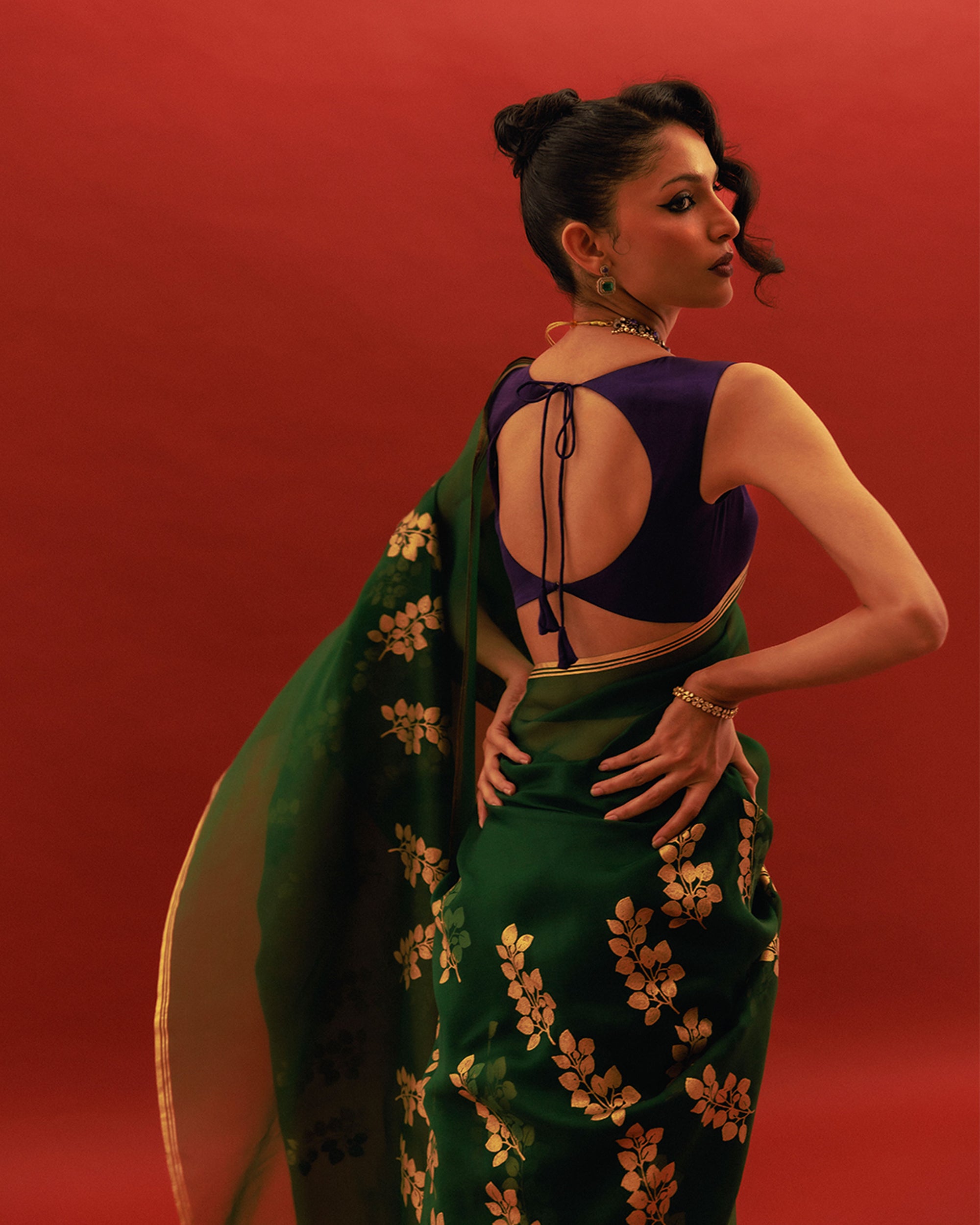 Delving into the artistry of our hand-dyed, hand block printed, and embroidered sarees. Each uniquely designed print is exclusive, setting us apart. By using the finest materials and techniques, each saree is a labor of love, reflecting our commitment to quality and distinct language of craftsmanship.